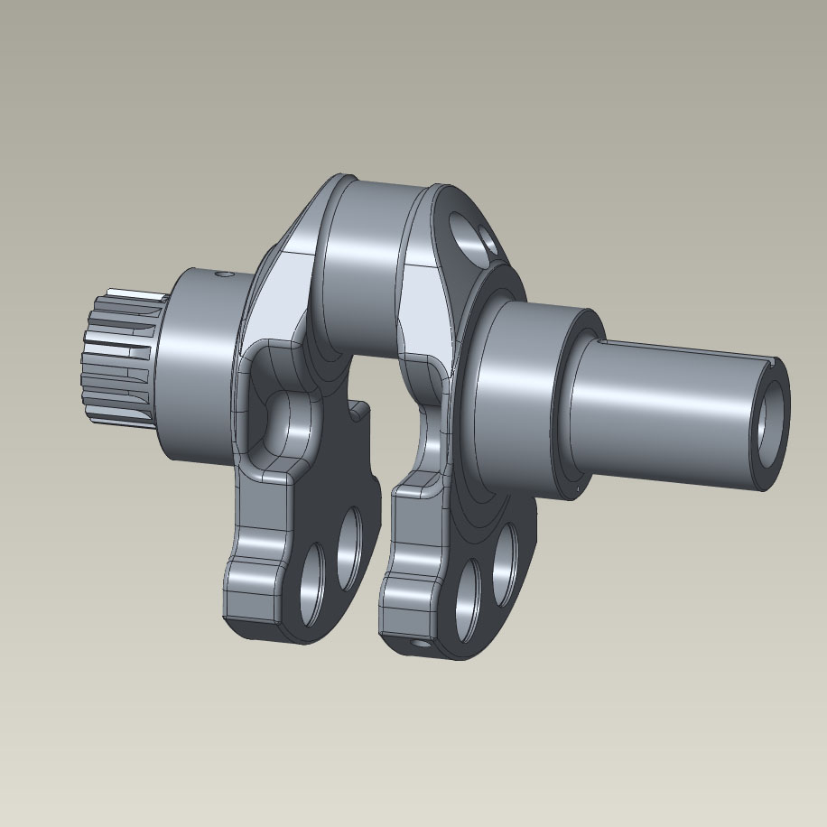 The main dimensions of the crank (journals diameters, stroke) were retained from the Ducati part to make bearing sourcing a simple proposition but the other proportions were made to match the new single cylinder application.  The resulting design is short and rigid, two nice adjectives to use for a crankshaft.