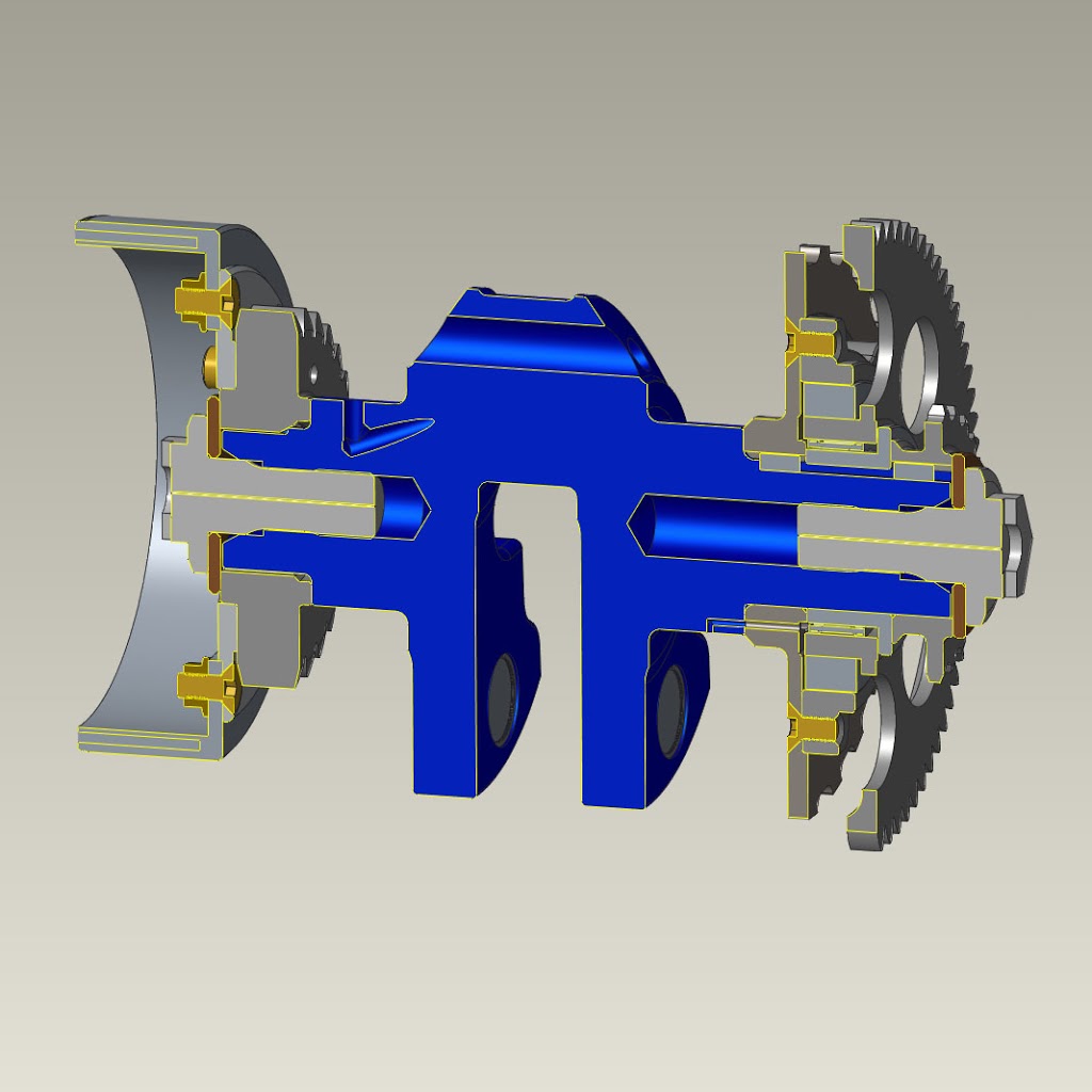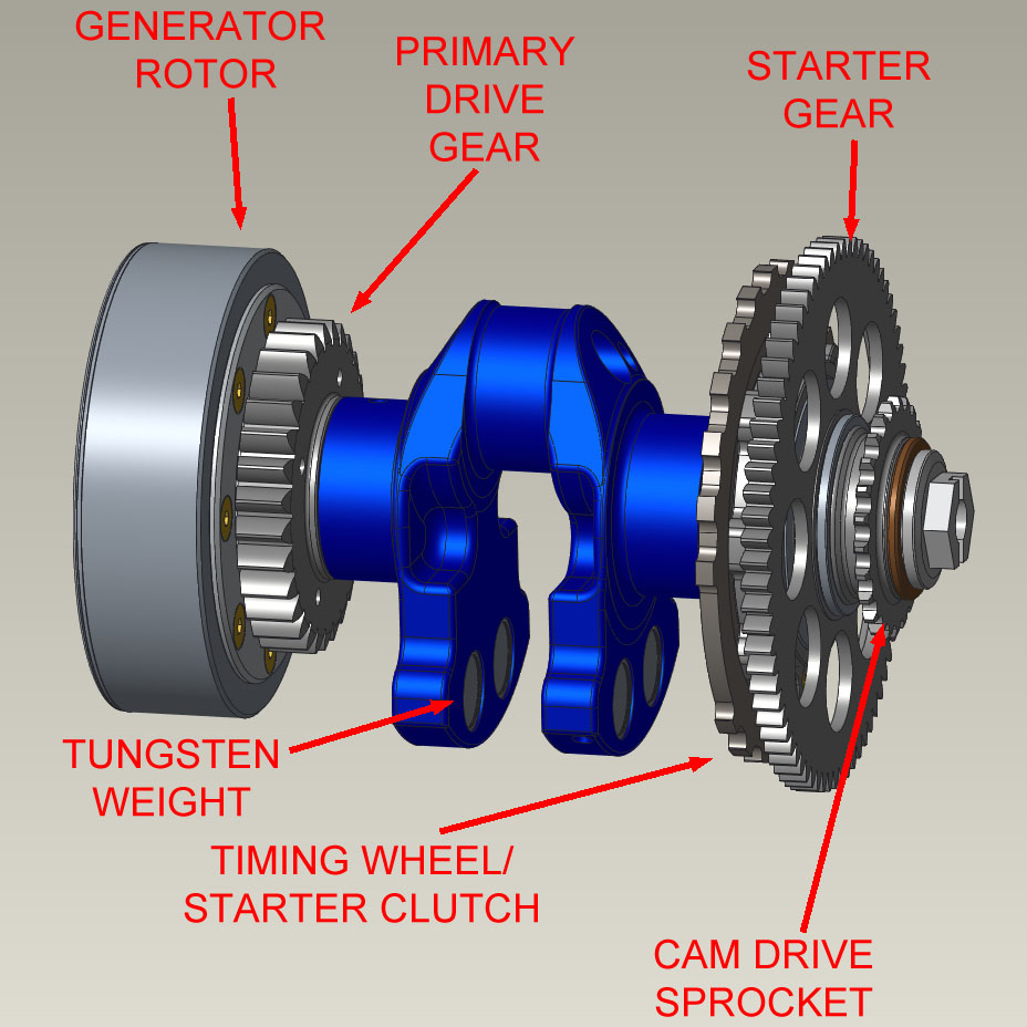 The crank assembly is configured a little different than most crankshafts due to the idler gear being between the crankshaft and the clutch.  This gives me the same radial room on both ends of the crank for components.  As the design progressed and I shuffled components back and forth, the best overall layout ended up with the primary drive gear and generator on one end, and the timing wheel/starter clutch, starter gear, and cam drive sprocket on the other.