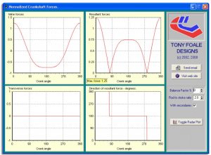 Determining the optimum engine balance factor was not straightforward.  The offset cylinder complicated the situation enough that a simple piston primary and secondary force analysis was not sufficient.  Again I called on the help of Tony Foale to determine the best approach.  One of his papers on engine balance  and his basic engine balance software were a good starting place.