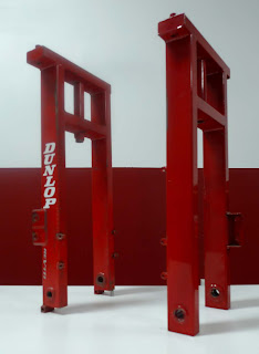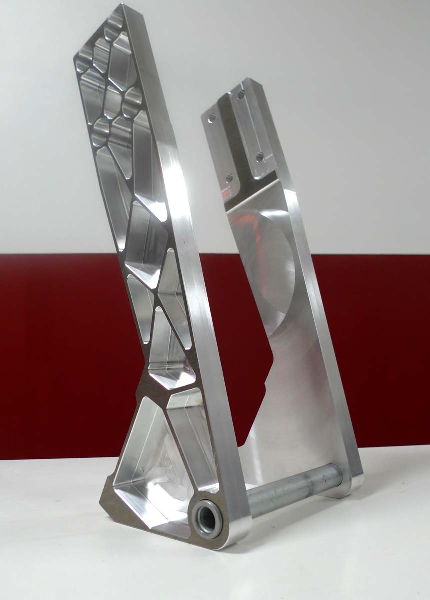 After working on all these engine parts I got a bug to shift focus and to make some inroads on the pile of chassis parts that need to be made.  My first choice was to make the upright legs for the front suspension.  These legs are central to the variable flex idea that is incorporated in the front suspension.  Instead of following the current ideas on overall bike flexibility which uses stiff telescopic forks and a slightly flexible chassis, I prefer to have the flex where it is needed-at the wheel.  Telescopic fork equipped bikes don’t have much of an option here- the forks needs to be relatively rigid, otherwise they would bind up when flexing under braking load, preventing smooth suspension movement.  With the linkage suspension I am using it is possible to have a very stiff chassis and a-arm structure to allow smooth suspension action and accurate wheel location yet have flex built into the upright legs to accommodate small bumps and irregularities in the surface when leaned far over.
