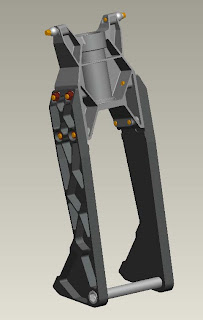 This version separates the parts into a bearing carrier and legs that bolt on.  It enables easy modifications to the stiffness by making new leg parts with varying dimensions yet keeps the bearing mount arrangement stiff.  The weight is in between the first two designs, a good overall compromise in my opinion.  The upright legs will be machined today.