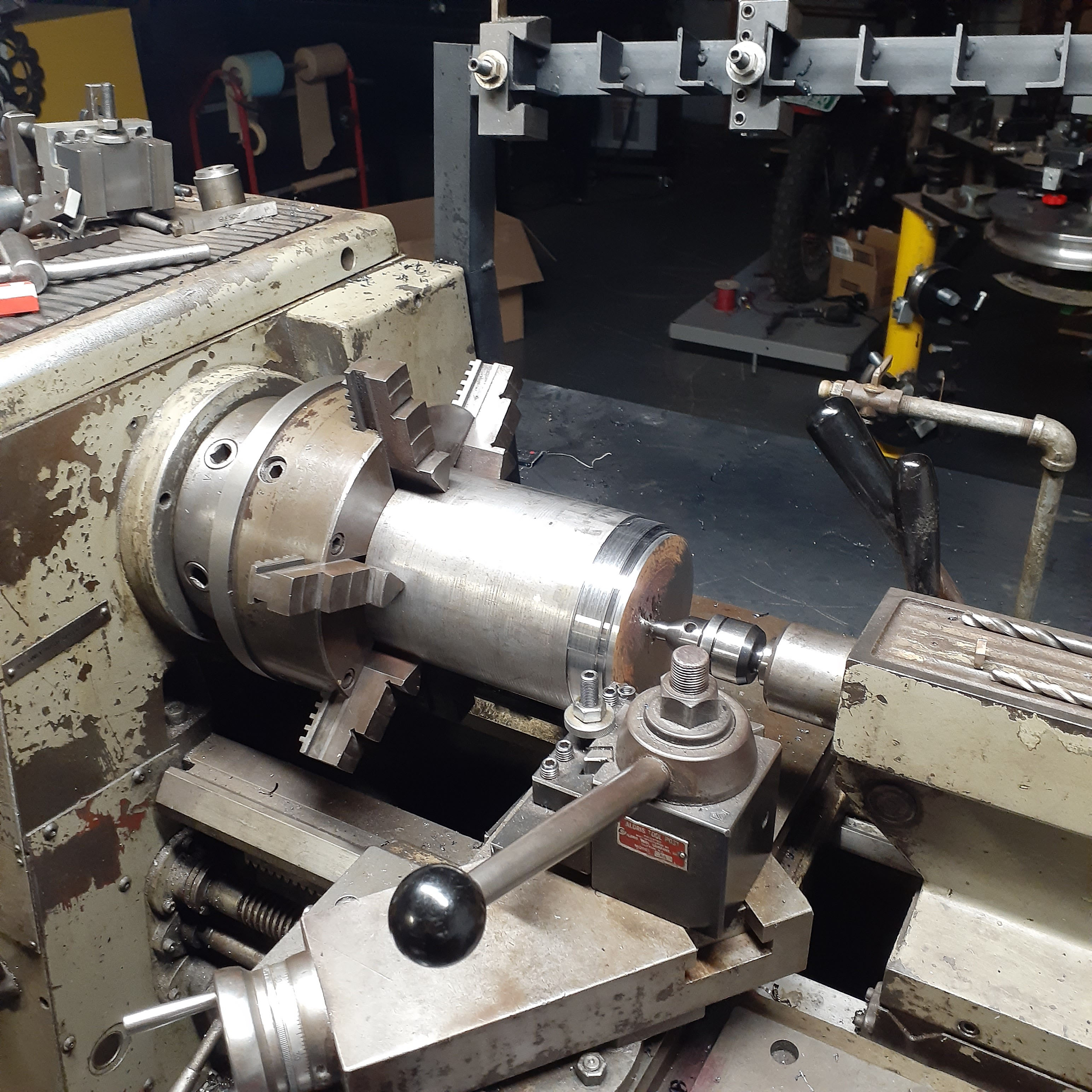 After making some good progress with the chassis castings, attention was turned back to the engine. Its time to start cutting metal for the crankshafts. I have 3 billets of 4340 vacuum melt steel in Rc28-32 condition that is just waiting for the part inside to be released. The billets are 5.5″ diameter x 7.25″ long and present a problem in how to hold for the first operation. I do have a 8″ 3 jaw chuck for the Eurotech CNC lathe, but I don’t have jaws for it and have never installed it. In the interest of getting parts made quickly and not doing machine maintenance, I decided to use my neighbor Peter’s Clausing lathe to turn a 2.375″ stub on one end of each billet. That would fit into my largest main spindle collet, allowing all further operations to be collet-based.