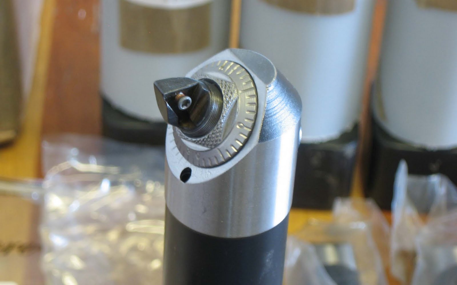 Each bar has an angled machined pocket at the extreme end that receives a Devlieg Micro-Adjust carbide insert holder.