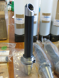 The boring bars are of the Devlieg adjustable insert style with an integral CAT40 shank. This will maximize accuracy and rigidity versus a boring bar held in a collet or end mill style holder.