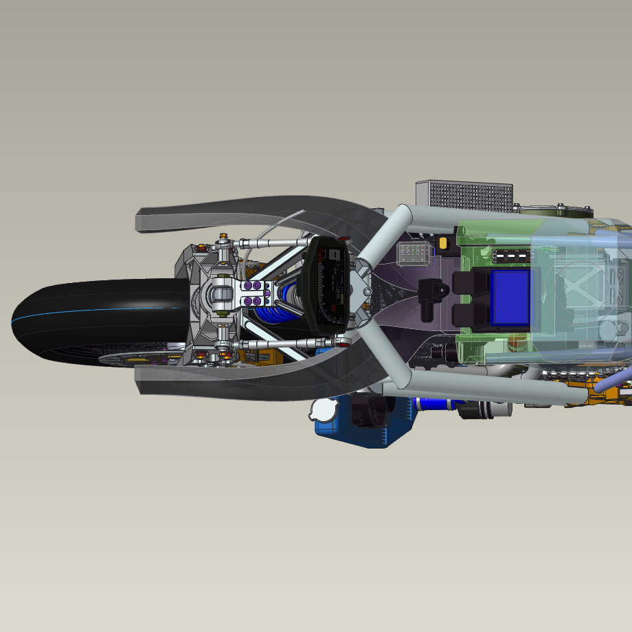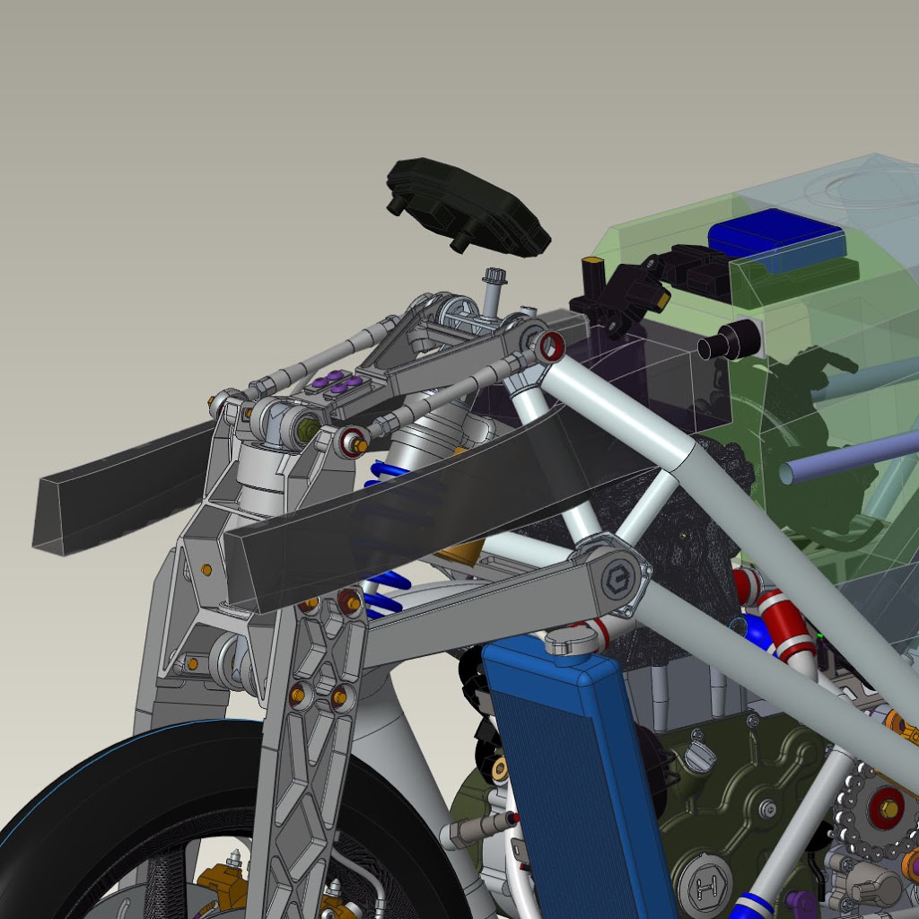 For the air runners, I determined the minimum air intake size, doubled it, then used Creo’s advanced 3d surfacing features to create duct with a curvature-continuous walls and a linearly increasing cross-sectional area. This helps slow the air from road speed to 0 with minimal losses, ensuring max static pressure. Even though ram air benefit is pretty small for a bike that can only do about 160mph, it makes sense to try to get what you can if it does not get in the way of something else that is more important.