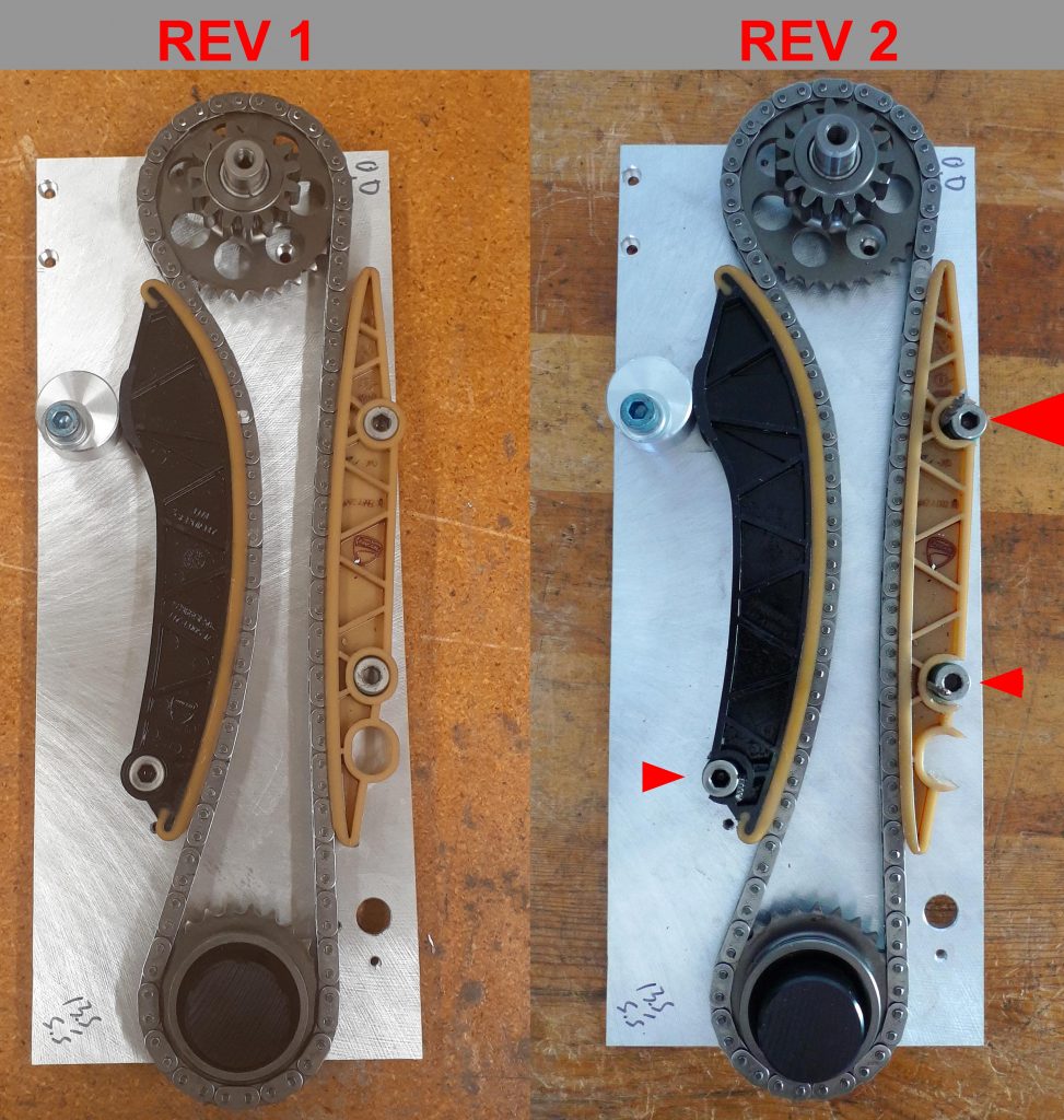 At the end of the last post, I had made a mock-up of the cam chain drive system with guides to ensure proper alignment for best performance and lowest friction. It seemed that the positioning needed some adjustment so I sent some questions to Thomas at IWIS, the cam chain manufacturer. Thomas quickly responded, highlighting the same areas I had been concerned with.