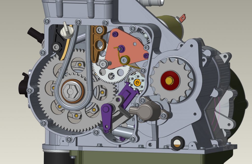 Now that the overall layout was complete, the task switched to finding a spur gear to mesh with the unknown specification Ducati gears.  Some quick calculations showed the gear to be a metric 1.0248 module.  That’s a pretty odd size so it is most likely that it is a modified 1 Module gear.  Gears in vehicle transmissions are not as standardized as you would expect.  The constant fight between center distances, gear pitch/tooth count, and NVH considerations force gear designers to use standard hob profiles in non-standard ways.  An easy example is when you want to fit 6 different gear ratios that all mesh on the same shaft.