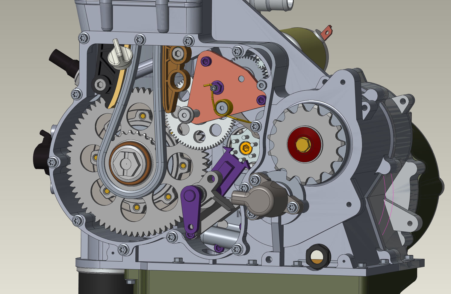 Setting up centers for the oil gear drive train was pretty straightforward, just copy center distances from the existing parts.  The multi-stage starter gear train will be a bit different. In the ever delicate dance that is the mechanical engineer’s packing compromise, the starter gear train could not be used as-is.  To get the tidiest overall engine package, I had to take the counter-intuitive step of making the starter gear drive system larger.  With my unique middle counterbalance placement, space inside the engine was tight.  I could swing the starter to the bottom or front of the engine with the OEM starter arrangement, but that would have increased the overall engine size.  If I could stretch the starter drive train’s overall center distance, the small crankcase dimensions could be retained, with the relatively heavy starter motor being placed on top of the transmission and under the throttle body, helping centralize engine mass closer to the bike’s overall C of G.