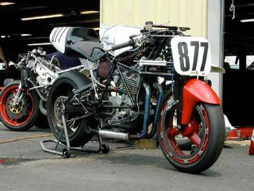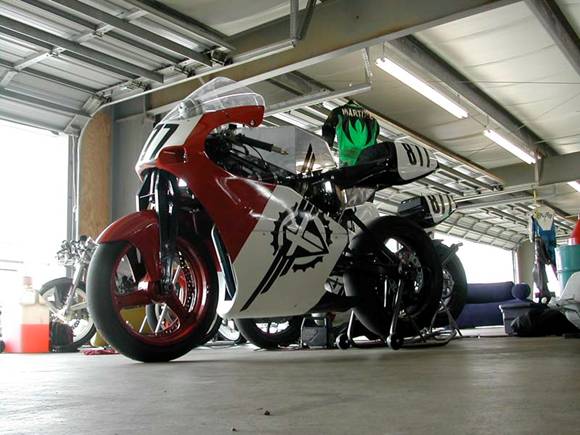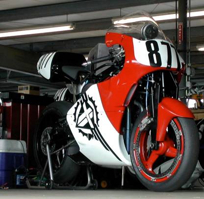 These pictures were taken at New Hampshire International Raceway. They show the bike in its final form, complete with fairing and bodywork painted in team colors. The motorcycle has garnered much interest, as it is a rare occurrence for a privateer to design and construct his own race vehicle. Initial testing has provided extremely positive results, and 1st place finishes are not far away. |