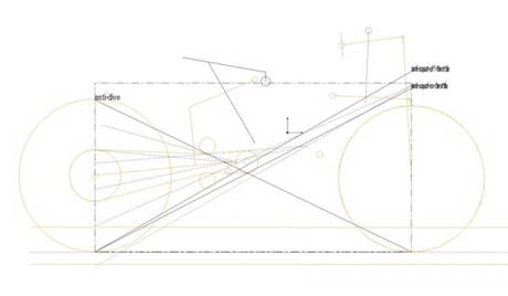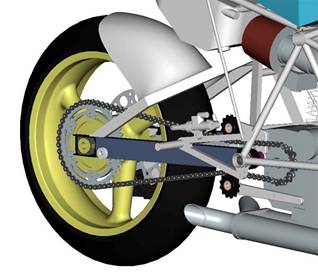The unusual designs of the front and rear suspensions is a conscious effort to precisely control the various forces involved in single track vehicle dynamics. |
