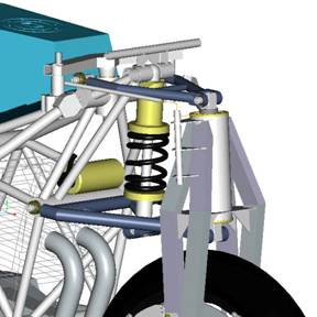 Once the determining behavior of the vehicle was specified, the task became to package all the necessary components into a compact, mass-centralized design. The complexity of a project such as this cannot be underestimated. Many issues, including safety of the rider at speeds in excess of 150mph, needed to be thoroughly ensured. Various test fixtures were designed and fabricated to validate subassemblies of the overall design before being finalized. |