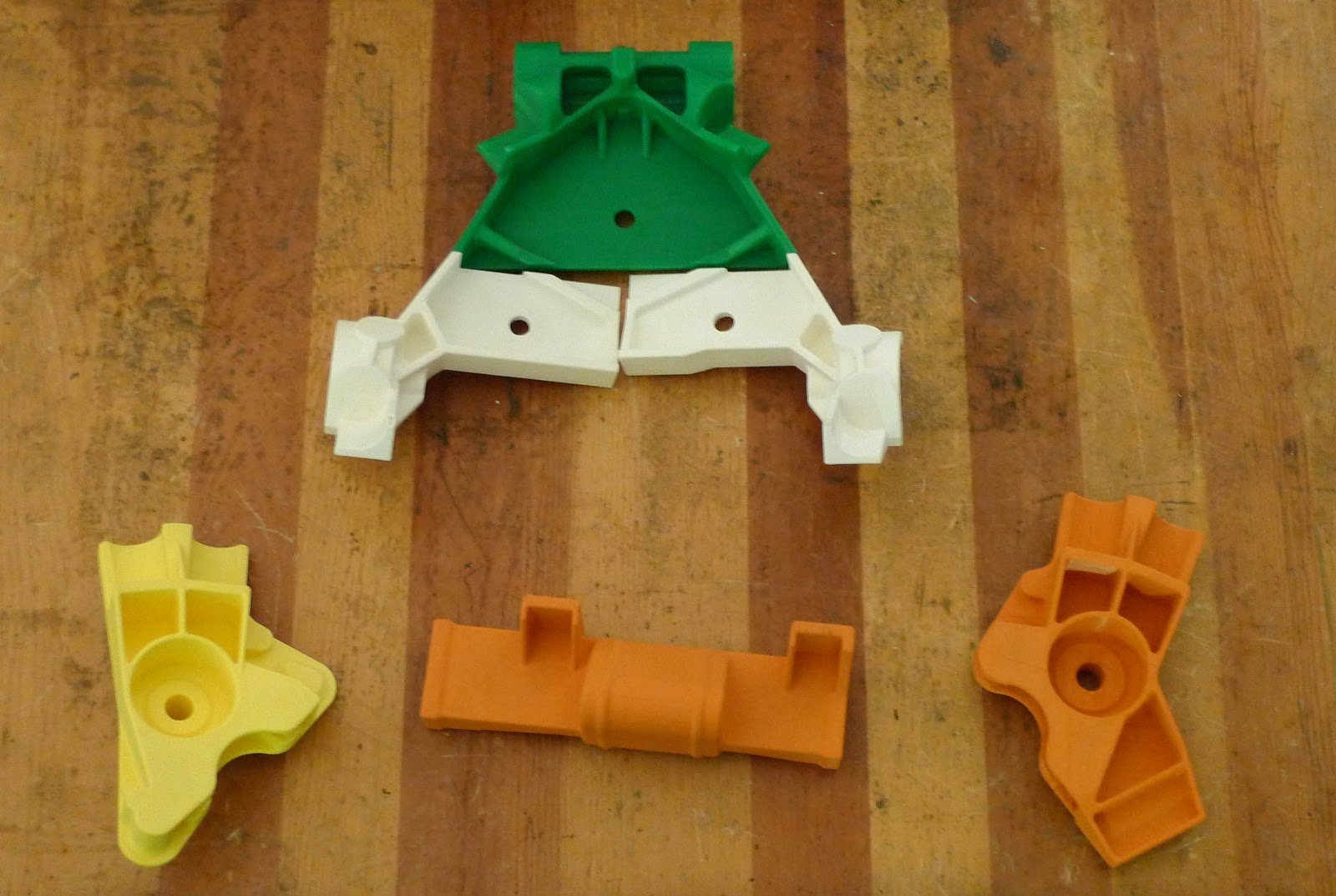 The largest part was too big to produce in one piece so had to be sectioned up. The various colors have no meaning and are only due to what color was in the machine at the time.