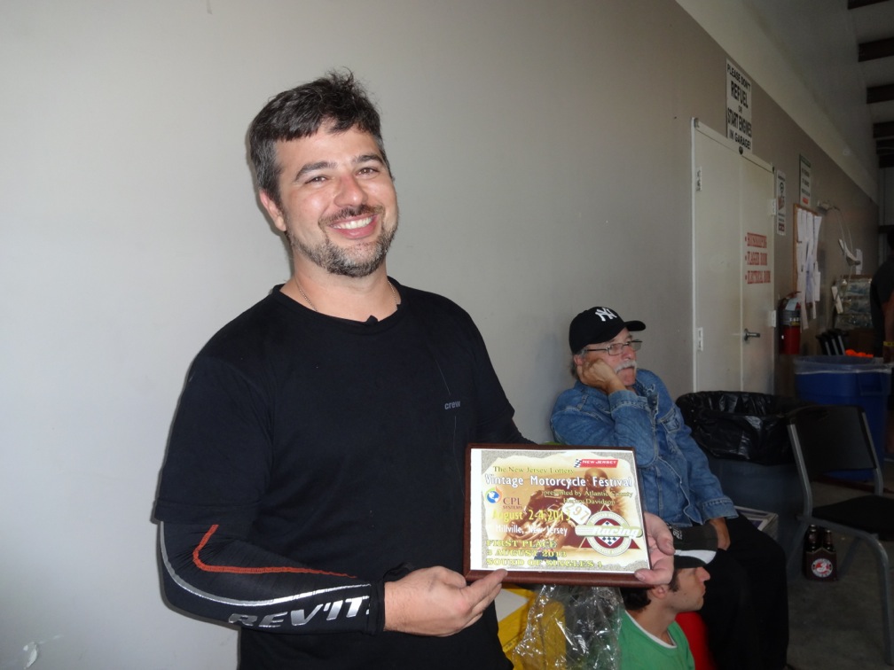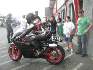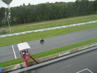 I was having a bit of fun. Due to the rain and the slick tires I could spin the rear at will. OK, I was having a lot of fun! What I didn’t know was that all my friends were on top of the scoring tower and could see me around the entire track and I was putting on a pretty good show! About 2/3 of the way throgh the race the bike start coughing and spitting a lot. They could hear it on the tower. Thinking some water got in the electronics I was hoping to just nurse it home. The only problem was that it ran best when wide open so that’s what I had to do. That’s when the weirdest thing happened. 2 bikes came past me and it turns out they were the leaders of the twins class (which started in the first wave, I started in the 2nd wave) and they were lapping me. They lapped me so I only had to do a 7 lap race, not 8! The bike couldn’t die on the last lap because this was my last lap! I don’ think anyone has ever been happy being lapped until today. Talk about making lemonade when the world gives you lemons!