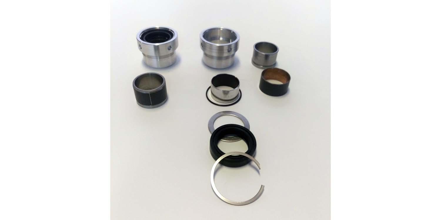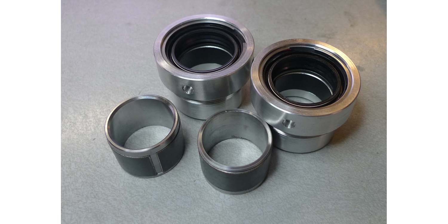The kit includes a set of machined adaptors that hold custom Teflon-lined bushings onto the OEM bushing mount points and uises a low friction fork seal with retaining ring to further reduce fork stiction. This is the same bushing style in modern OEM Showa and Ohlins forks and provides low friction and reduced oil contamination as compared to the OEM bare metal bushings. The upgrade kit is drop-in and requires no modifications to the fork components. It comes with all the parts necessary for installation including a set of standard Norton dust boots. It is recommended to increase the fork oil viscosity when installing this kit as the reduced friction significantly changes the damping characteristics. If you are a user of my Roadholder Damper upgrade kit, I recommend going from 5W to 10W Redline fluid to account for the reduced friction levels.