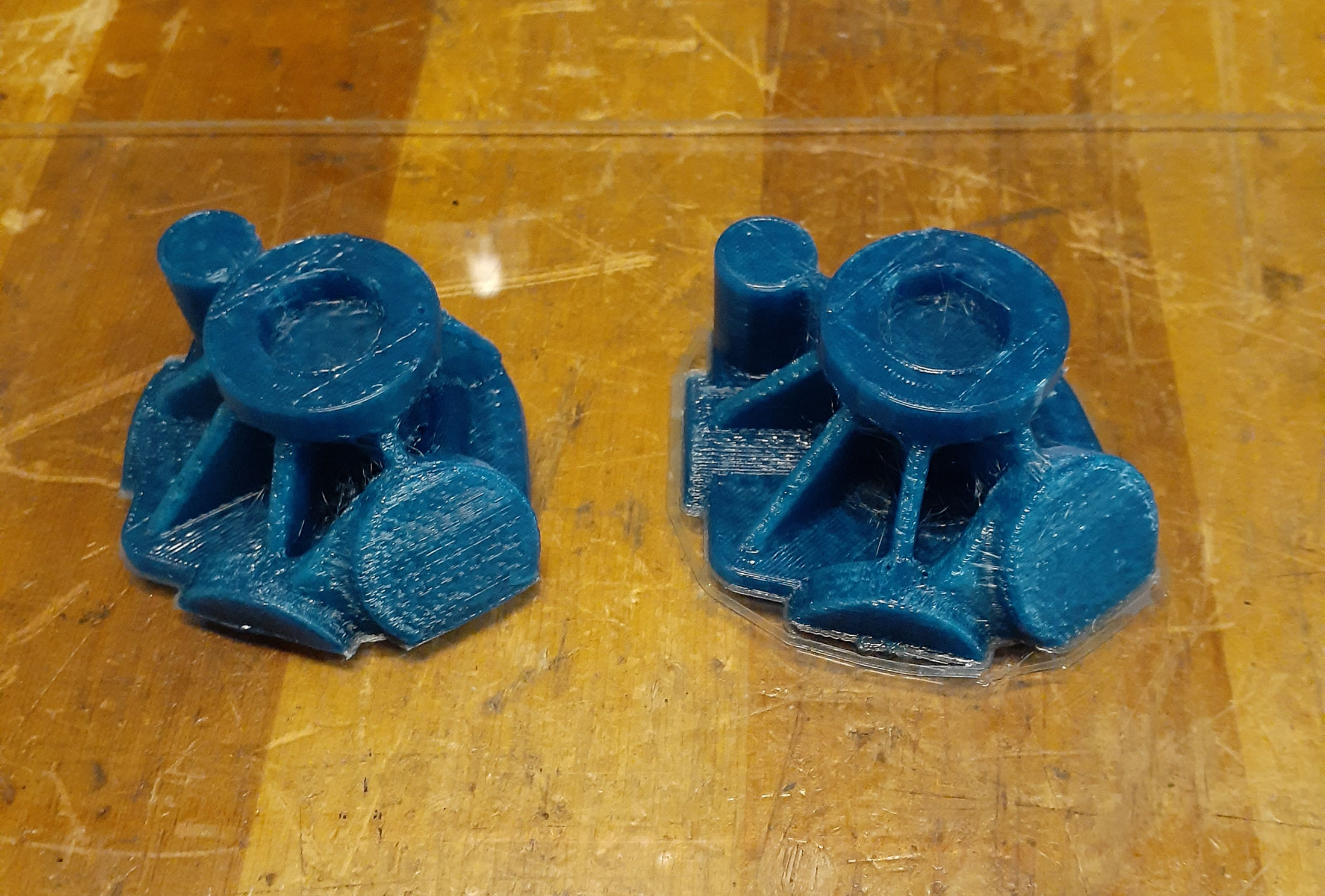 A print (right side) with slightly lower temps (140C print, 85C bed) came out marginally better. I’ll wait for some feedback from machinablewax.com’s tech support before doing any more print tests.