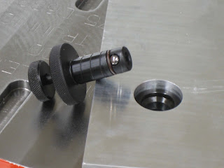 The surface of the table has features to locate a Kurt vice and a square pattern of Ballock locating/clamping pins that for use with a fixture plate that will allow me to index the parts 90 degrees with an accuracy of +/- .0005″. He supplied 3 ready to use fixture plates made from Mic6 cast tooling plate.